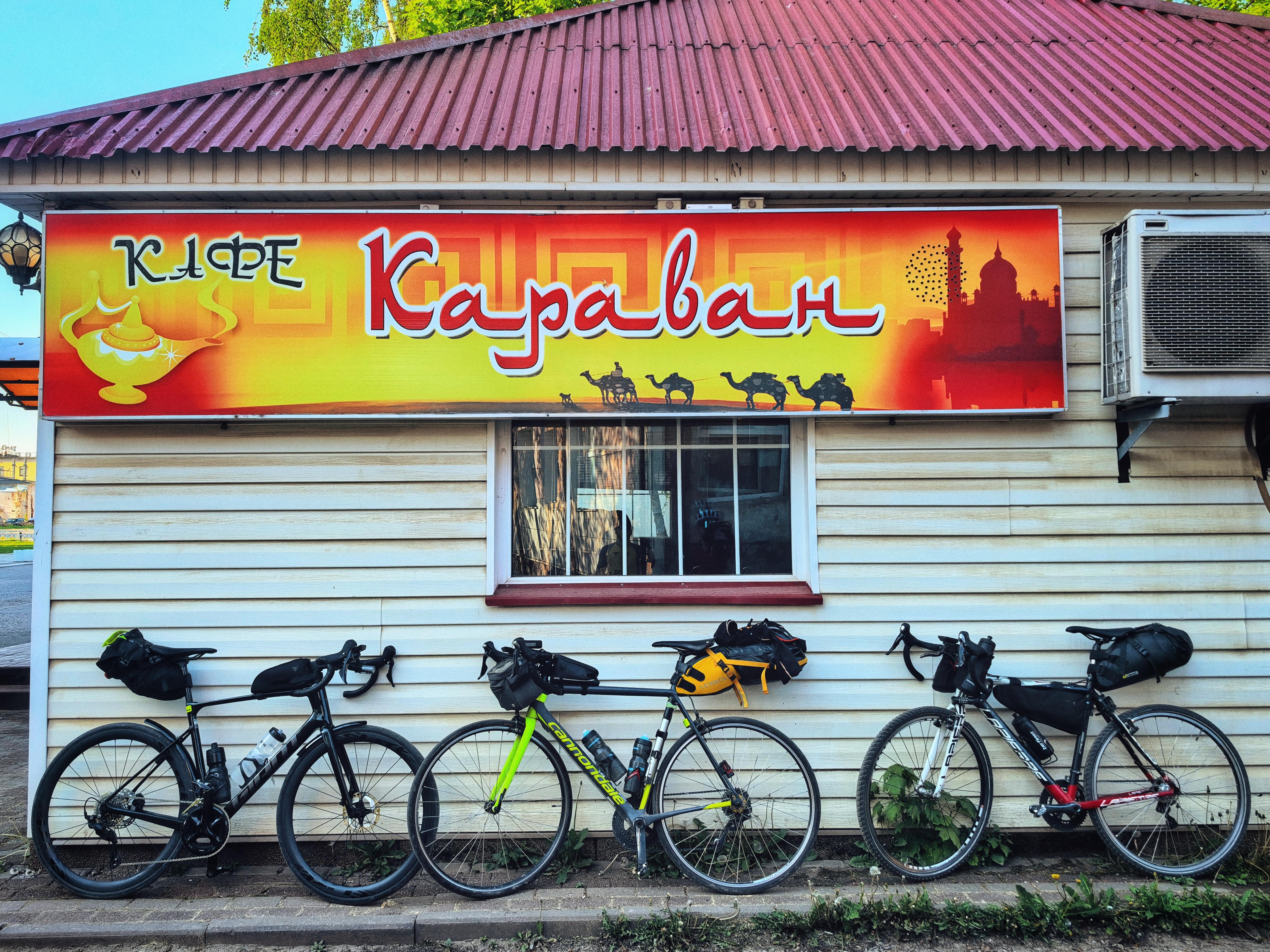Юре было явно тяжело ехать, Слава тоже что-то поник. В общем кое-как доехали 35 км до г.Бологое (170-й км маршрута) и остановились на плотный ужин в кафе "Караван". Сильно выбились из графика.